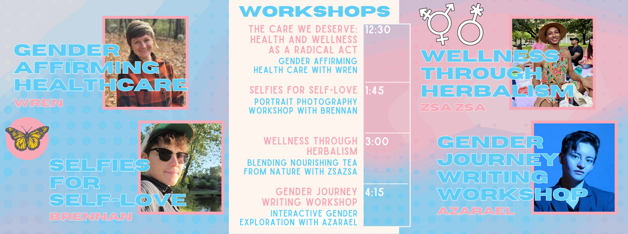 physical wellness, info-sharing, intergenerational conversations, counseling spaces, and advocacy relating to trans+ communities
